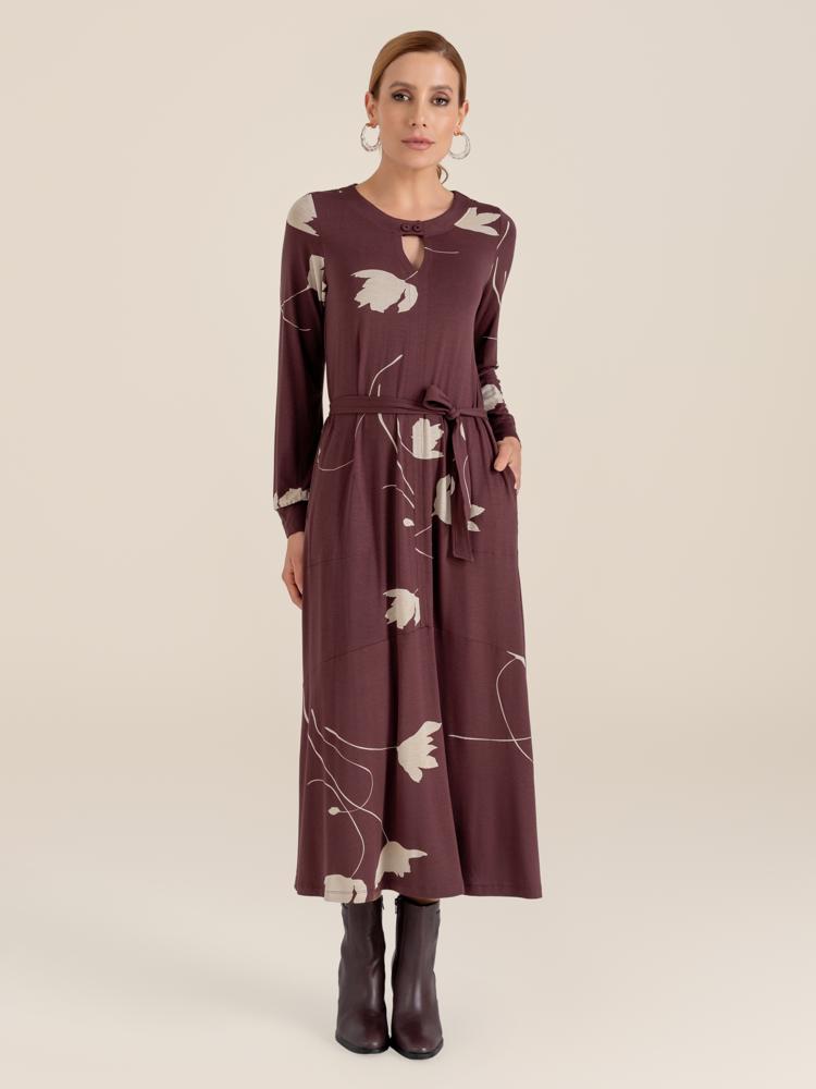 Vestido "Sussurro" Evasê Midi Manga Longa Vazado